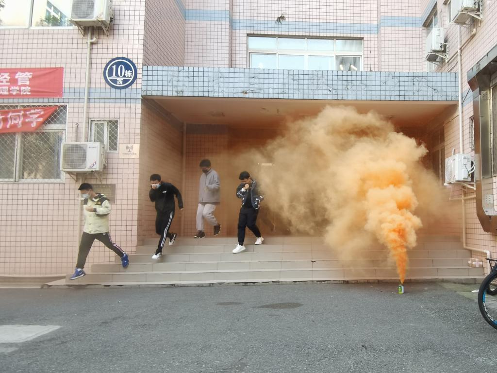 中午1点整,演练准时开始,公寓楼下升起浓烟,“呜——呜——”的警报声响起,参加演练的学生迅速反应,用湿毛巾和衣物捂住口鼻,弯腰靠墙前进,沉着冷静地从宿舍楼内撤离到指定地点。随后,学院公安局消防支队林伟警官向同学们讲解了常见消防器材区别、主要火灾类型等消防安全知识,示范了灭火器的正确操作方式,并指导现场学生准确快速地扑灭火源。