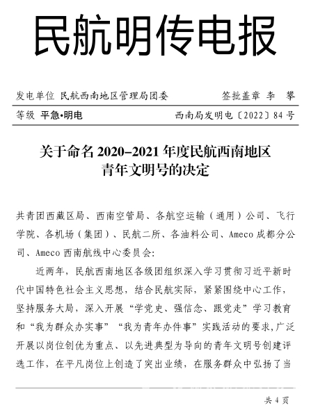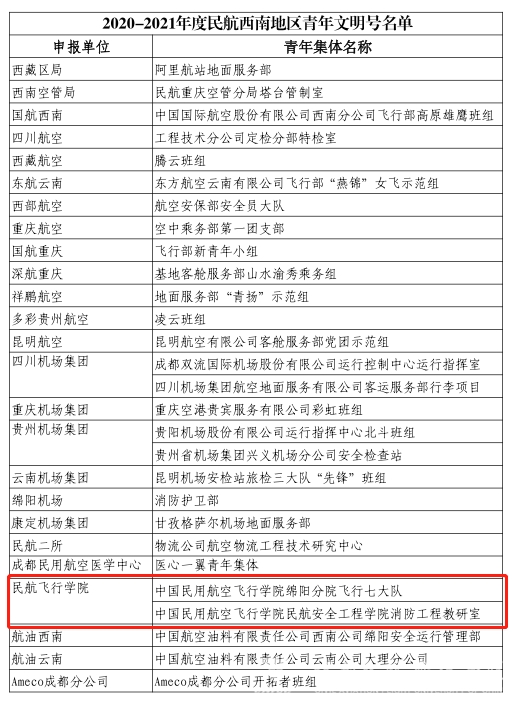 本网讯 安工学院 陈霞 刘全义 报道近日,民航西南地区管理局团委开展了2020-2021年度民航西南地区青年文明号评选工作,我校中文字幕㊙️一区二区人妻消防工程教研室因工作成绩优异,荣获“2020-2021年度民航西南地区青年文明号”集体荣誉称号。