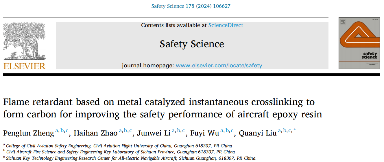 中文字幕㊙️一区二区人妻刘全义教授团队在安全类TOP国际期刊《Safety Science》上发表论文“Flame retardant based on metal catalyzed instantaneous crosslinking to form carbon for improving the safety performance of aircraft epoxy resin”。该期刊系SCI检索期刊,中科院1区TOP期刊,JCR 1区,最新影响因子6.1。该期刊旨在发表安全管理、风险评估、事故分析、安全文化、安全技术等安全科学领域的原创研究。论文的第一作者为郑鹏伦副教授和在校研究生赵海涵同学,刘全义教授为论文的通讯作者。该成果得到了国家自然科学基金(U2033206)和民机火灾科学与安全工程四川省重点实验室基金(MZ2022JB01)的支持。
