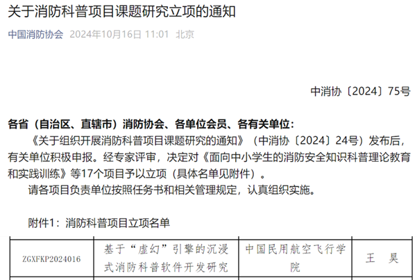 本网讯 王昊 刘全义 摄影报道:近日,我院在民航消防安全科普领域的研究取得新进展,王昊老师主持的《基于“虚幻”引擎的沉浸式消防科普软件开发研究》成功获得中国消防协会批准立项,这是我校首次获社会服务科普项目,将为我院安全科学与工程学科专业建设提供重要支撑。
