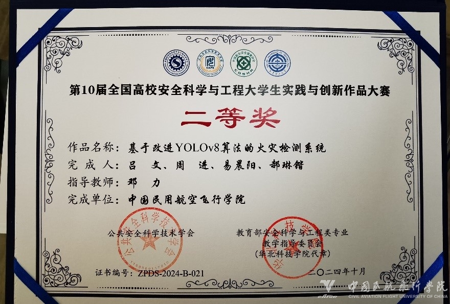 在学科竞赛与学术交流上,我院同样硕果连连。邓力老师带领学生参加了此次年会的大学生实践与创新作品大赛,荣获二等奖(图5)。他们的作品研发了改进的YOLOV8算法,融入GhostNetContainer网络优化模型,开发界面连接模型进行火灾检测,取得了良好的效果,具有广泛应用于多种场景助力消防安全的潜力。此外,我院我院研究生梁家鑫在年会上详细介绍了锂离子电池在各阶段电热耦合行为及多尺度电-热耦合模型,为锂离子电池安全性研究提供了新的视角。这一研究不仅拓宽了学术交流的范围,也为相关领域的研究提供了重要的理论支持。