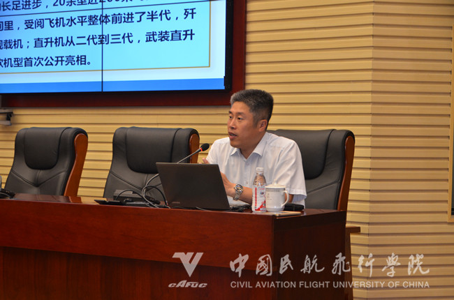 宋庆国为师生们所作报告的题目是《中华民族伟大复兴历史视野下的航空工业》。他从受阅飞机的发展、武装机试飞员的培养等方面列举大量实例为在座师生们奉上了一场精彩的演讲。